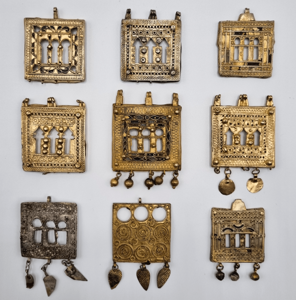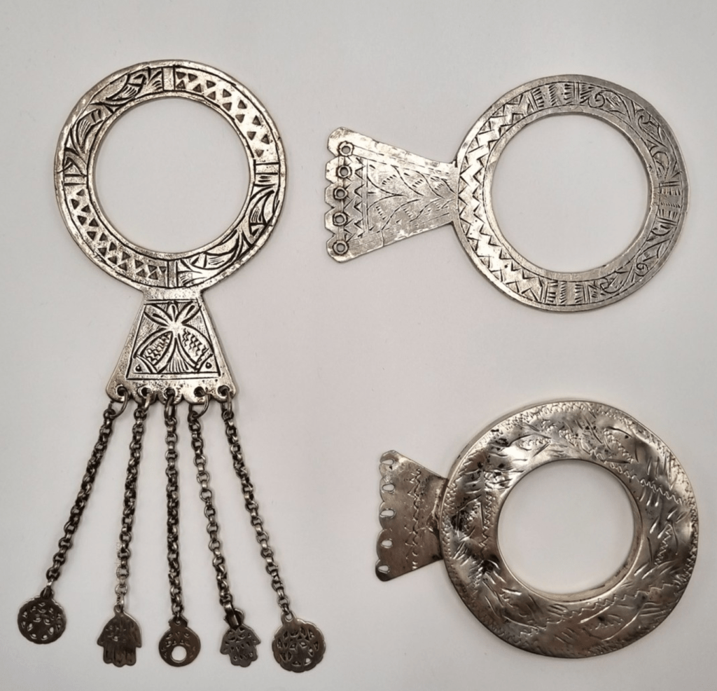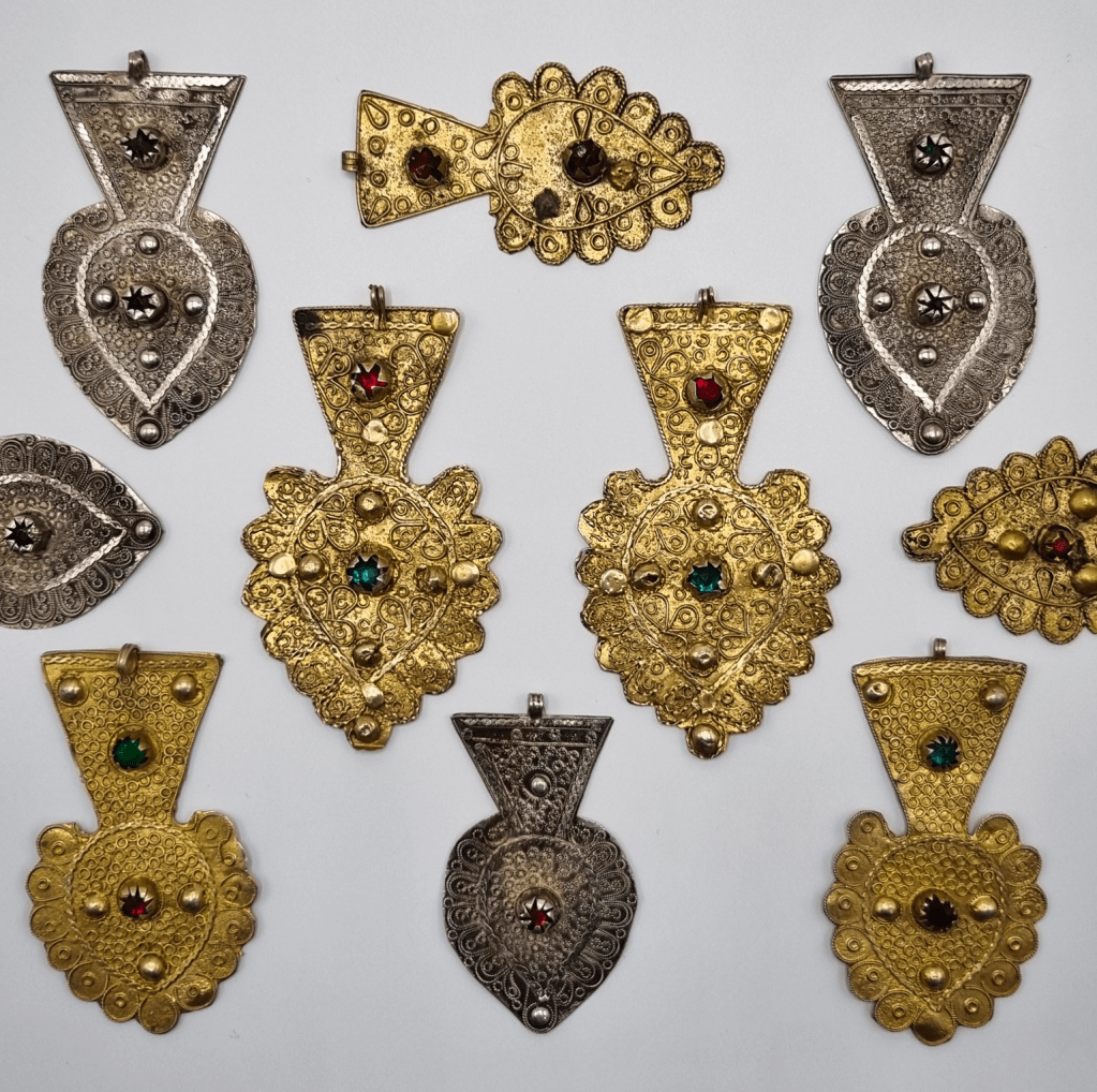 The collection shows how jewellery evolved over time, as it holds both older and newer items. The collection is also illustrative of how jewellery, as portable possession, traveled large distances: among the many Tunisian items are pieces from neighbouring countries such as rare beard combs from Libya, but also ornaments from Turkmenistan, Pakistan and Saudi Arabia. An important part of the collection is the selection of hand-shaped pendants, which illustrates the wide variety in forms and materials across the Maghreb. The collection also holds necklace elements, belt ornaments and belts, bracelets, clothing pins, varying chain elements, head ornaments, pendants and several items of clothing as well as combs.